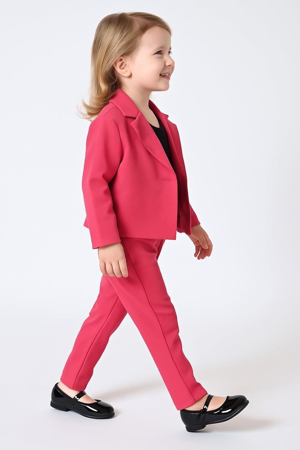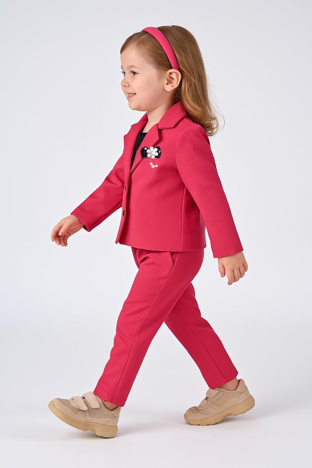 This charming two-piece formal suit set features a stunning coral pink blazer paired with matching trousers, perfect for special occasions and formal events. The blazer showcases a classic lapel collar, convenient button closure, and is adorned with a delightful decorative flower pin that adds a touch of whimsy. The well-tailored pants offer a comfortable fit and professional appearance. Made with quality fabric that ensures comfort throughout the day, this ensemble strikes the perfect balance between sophistication and age-appropriate style. The versatile outfit can be paired with various shoes and accessories, as shown with both neutral-toned sandals and classic black formal shoes in the styling options. This coordinated set is ideal for formal gatherings, special ceremonies, or any occasion requiring a polished look. The outfit demonstrates excellent attention to detail in its construction, making it a practical yet stylish choice for young formal wear.