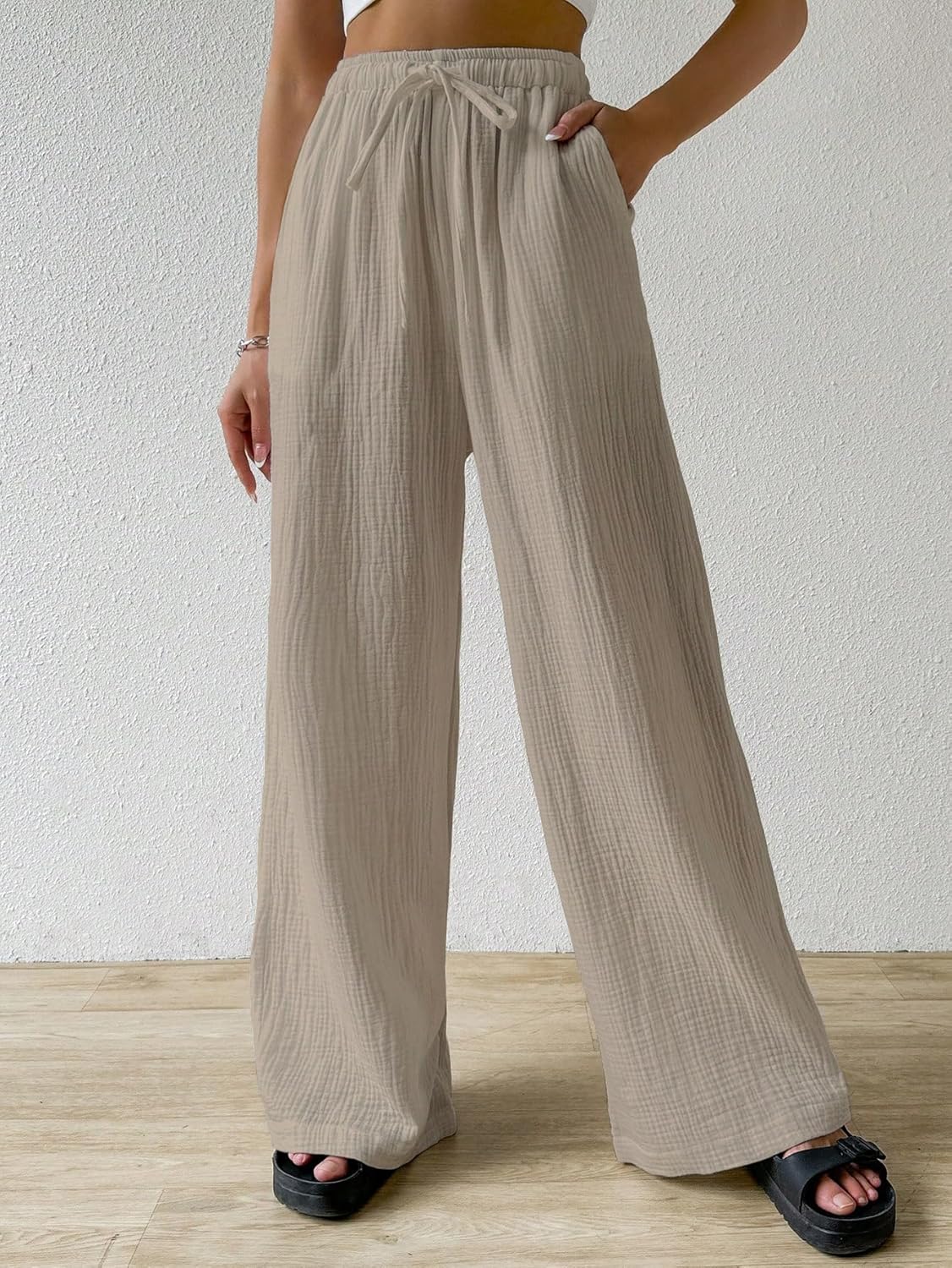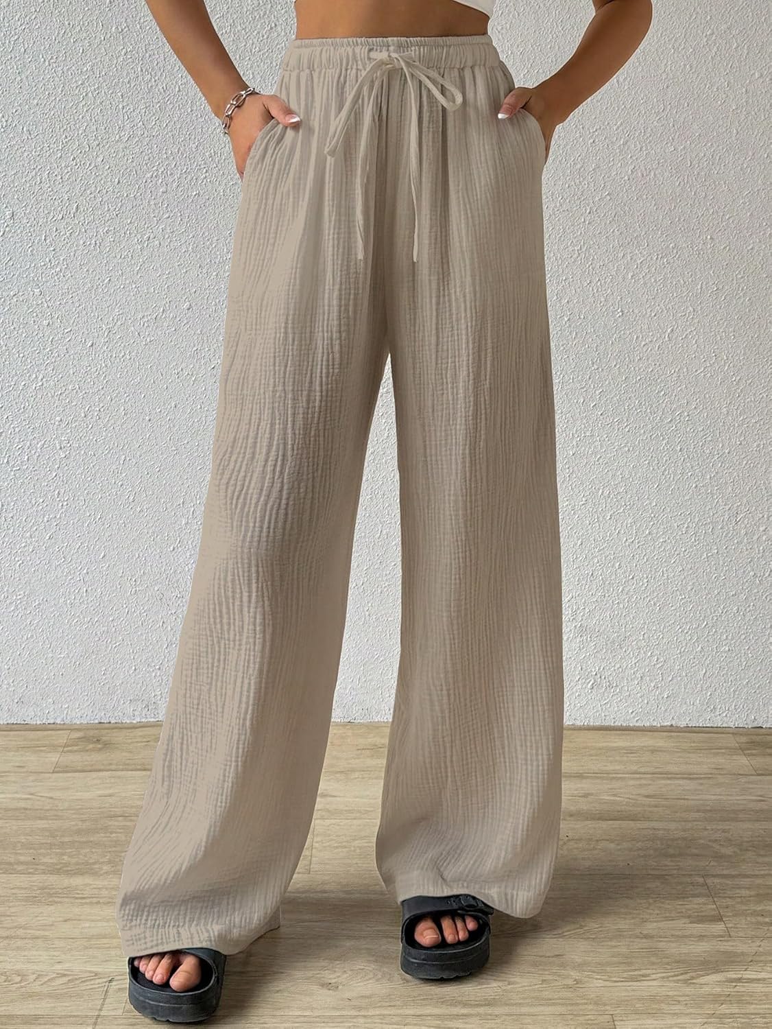 Shasmi Women’s Brown Loose Wide-Leg Pants With Textured Wrinkled Fabric And Drawstring Waist Long Trousers, Colour: Brown, Closure Type: Elastic Waist, Details: Drawstring, Knot, Pocket, Style: Casual, Pockets: Yes, Pattern Type: Plain, Type: Wide Leg, Waist Line: High Waist, Length: Long, Fit Type: Loose, Fabric: Slight Stretch, Material: Polyester blend, Composition: 92% Polyster, 8% Spandex, Care Instructions: Machine wash or professional dry clean, Temperature: Spring/Fall, Body: Unlined, Sheer: No