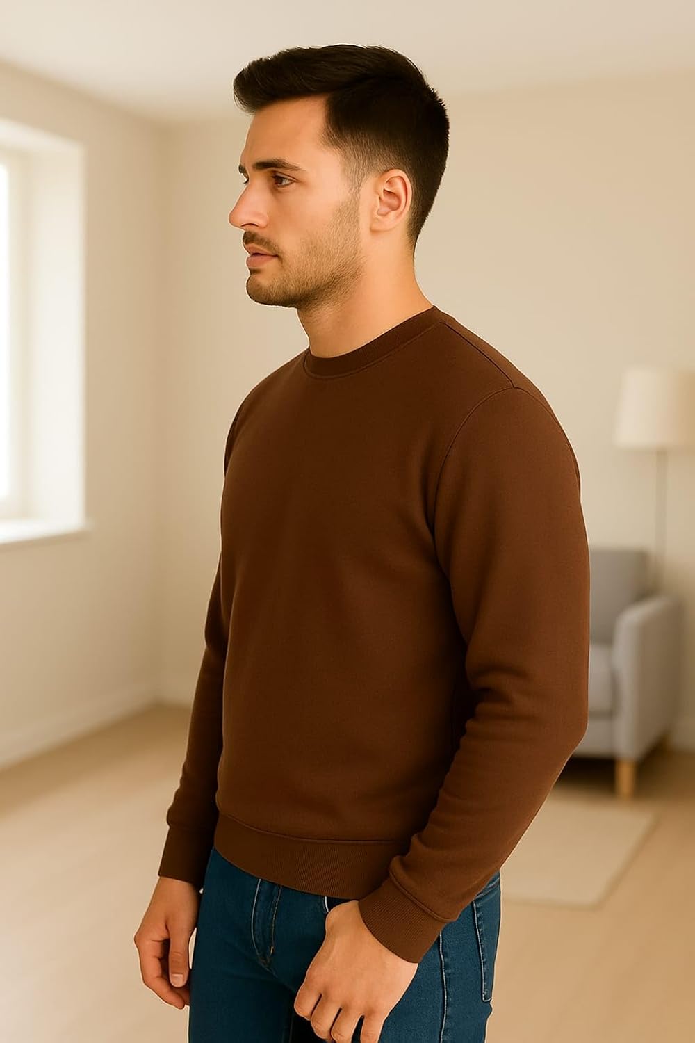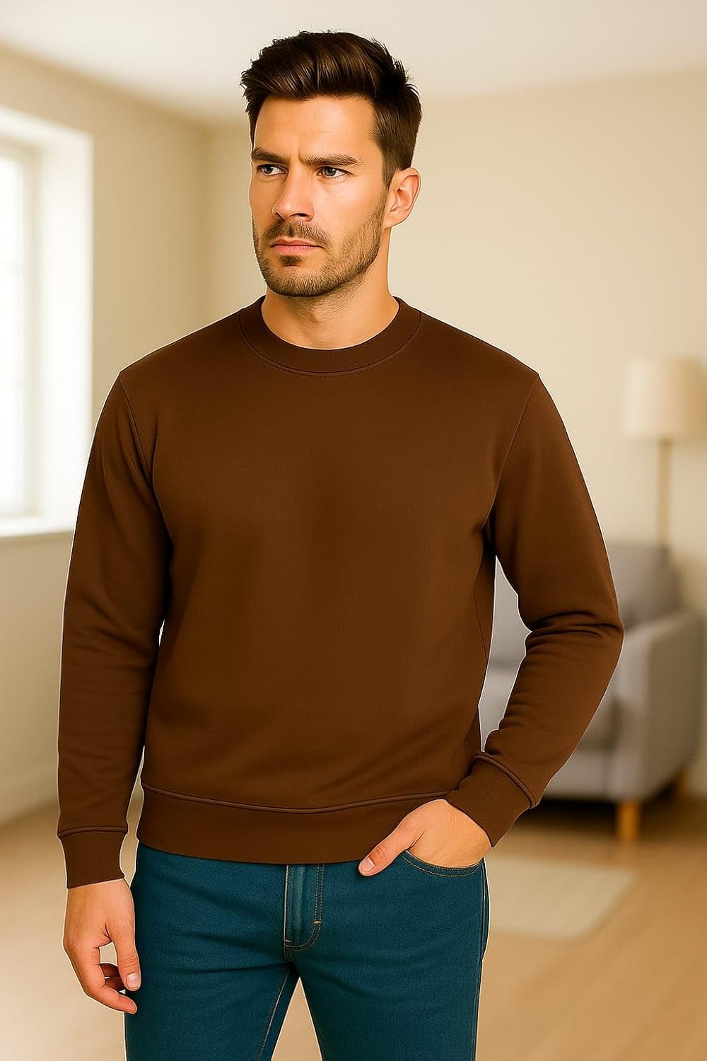 Upgrade your casual style with this Men’s Solid Skin Colour Sweatshirt, crafted from a soft and durable cotton-blend fabric. Designed for everyday comfort, it features a classic crew neck, full sleeves, and ribbed cuffs for a perfect fit. The elegant skin tone adds a modern, minimalist touch that pairs easily with jeans, joggers, or trousers. Ideal for casual outings, travel, or work, this sweatshirt keeps you warm without compromising on style. Lightweight, breathable, and easy to maintain, it’s a versatile wardrobe essential for all seasons.